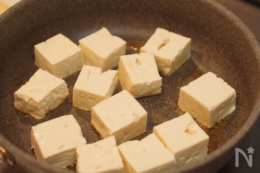 (3) フライパンにごま油をひいて中火で熱し、豆腐を並べて両面にこんがりと焼き色がつくまで焼く。