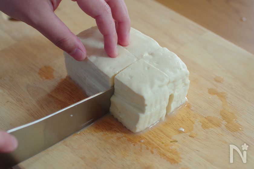 (2) 木綿豆腐は食べやすい大きさに切り、キッチンペーパーで水気をふき取る。