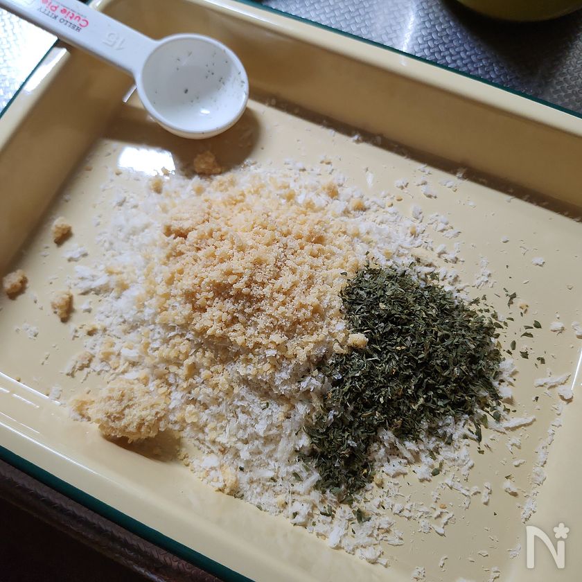 (2) 1のブロッコリーを、混ぜ合わせておいたチーズパン粉の上で転がしパン粉をまとわせる。