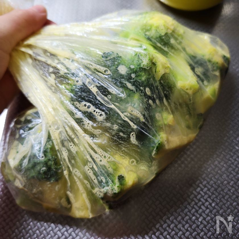 (1) ブロッコリーを入れたポリ袋に卵を割り入れ、ブロッコリー全体に卵液がなじむよう軽く振る。
