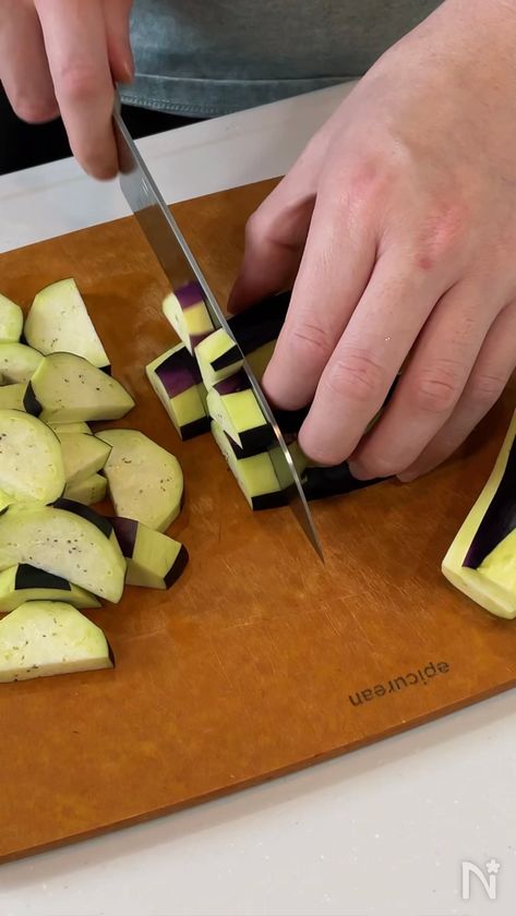 (1) ナスの皮を4箇所引き、1/2の大きさで1~1.5cm幅のいちょう切りにする。
