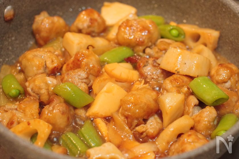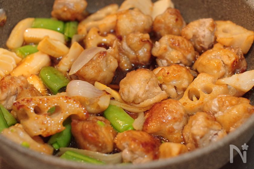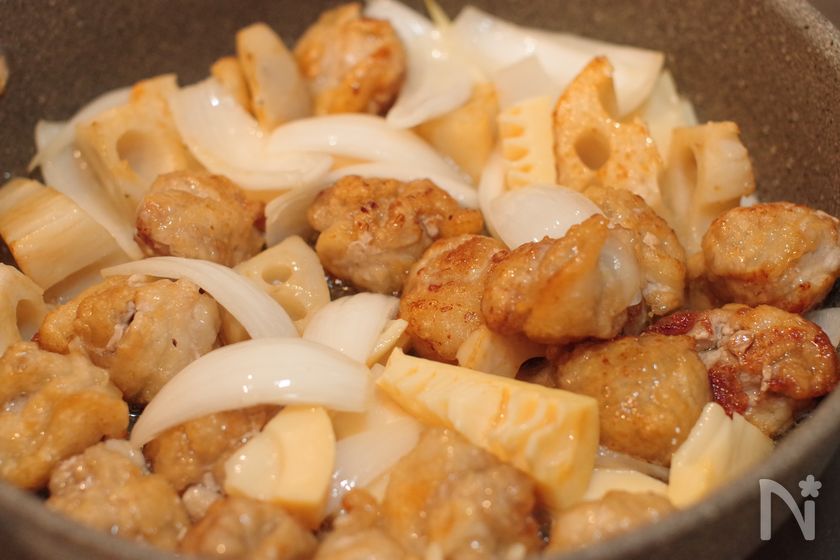 (4) 豚肉とれんこんに火が通ったら、新たまねぎとたけのこを加えて中火にして焼き色がつくまで炒める。