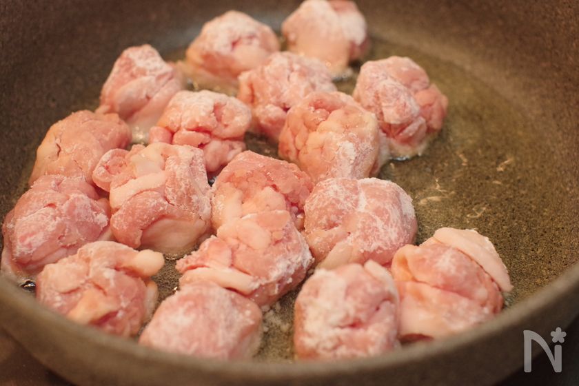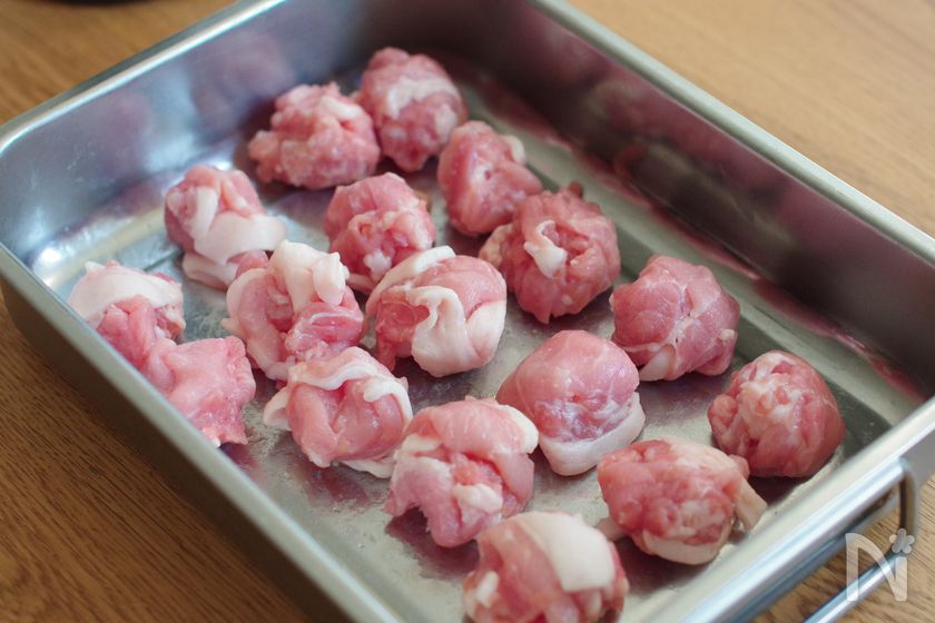 (2) 豚こま切れ肉に【B】を揉みこみ下味をつけ、小さめに丸める。片栗粉をまぶす。