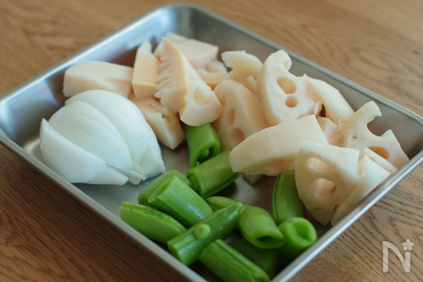 れんこんは小さめの乱切りにする。