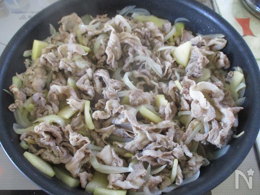 (2) 玉ねぎの上に豚肉の半量を広げて塩を少々→生姜の半量→りんごの半量