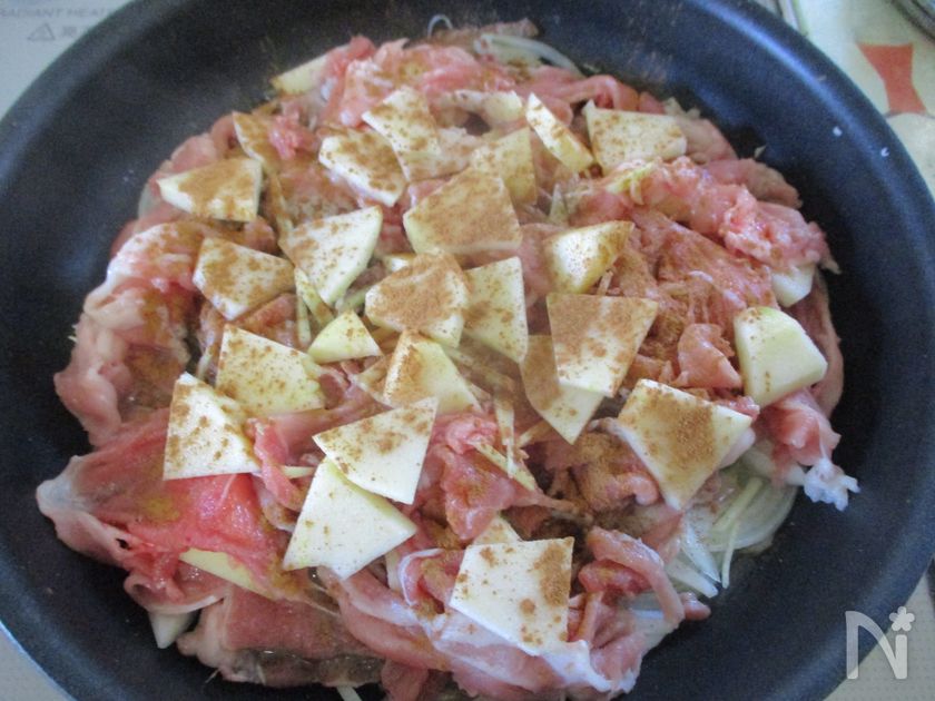 をのせたら、もう一度豚肉半量を広げて塩を少々→生姜→りんごの順に重ねる。最後にシナモンパウダーをパラっとかける。
