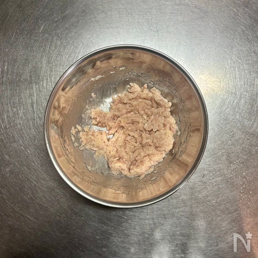 (2) ツナは缶汁ごとボウルに入れ、【A】を加えて混ぜる。