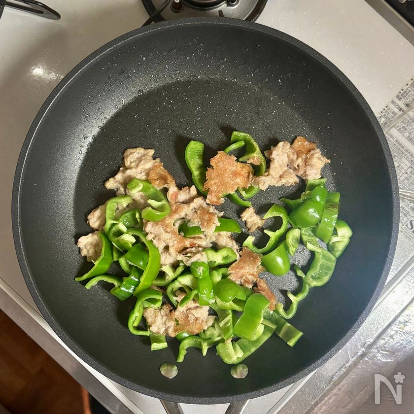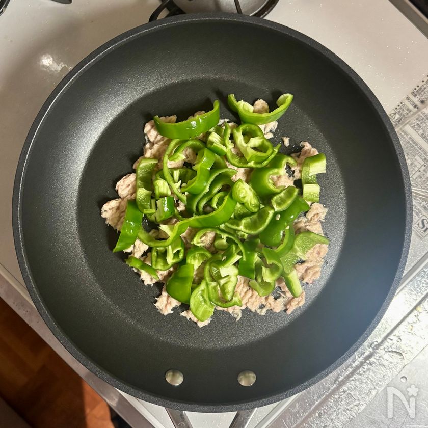 ツナをほぐしながら、ピーマンが好みの固さになるまで1〜2分炒める。