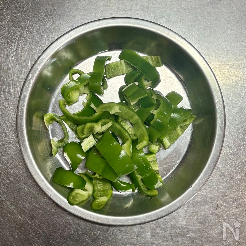 (1) ピーマンは縦半分に切ってヘタと種を除き、横7mm幅に切る。