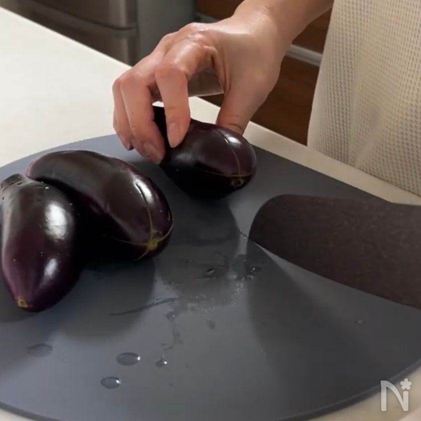 (下準備) ナスはヘタを取り、お尻の部分に十字に切れ目を入れておく。