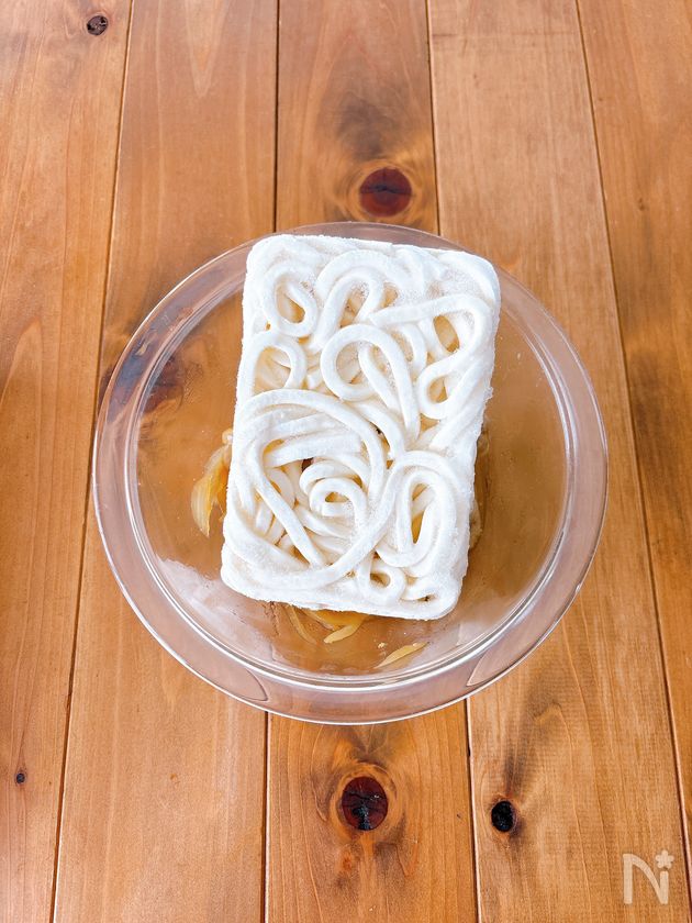 (2) 上に冷凍うどんのせてラップをし600Wで3分加熱し、しっかり混ぜる。