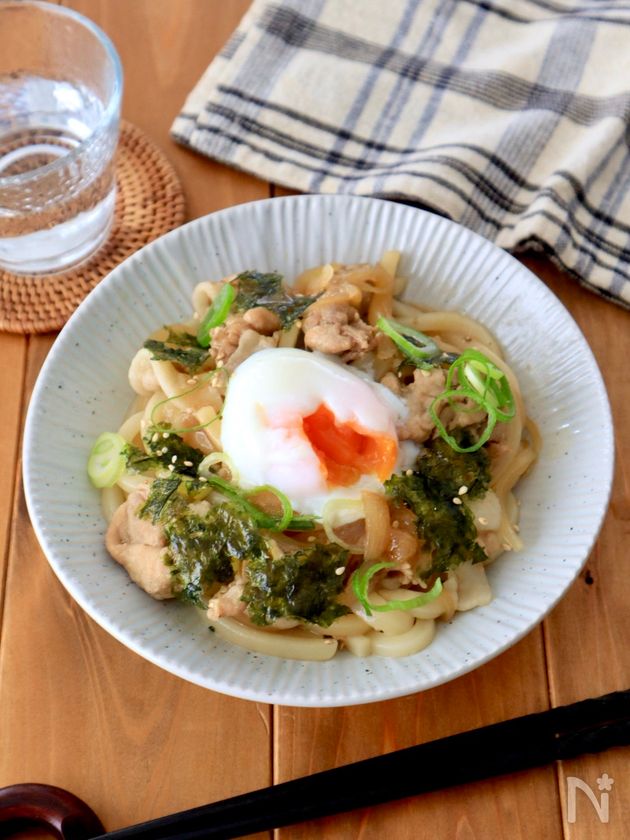 レンチンで完成!豚こま×温玉の韓国風スタミナうどん