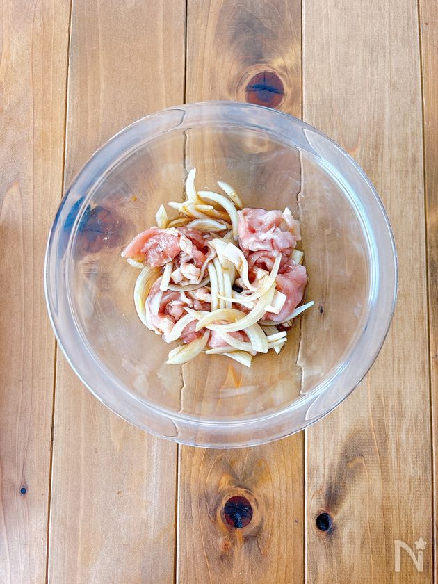 (1) 耐熱容器に豚こま、薄切りにした玉ねぎ、【A】入れて混ぜる。