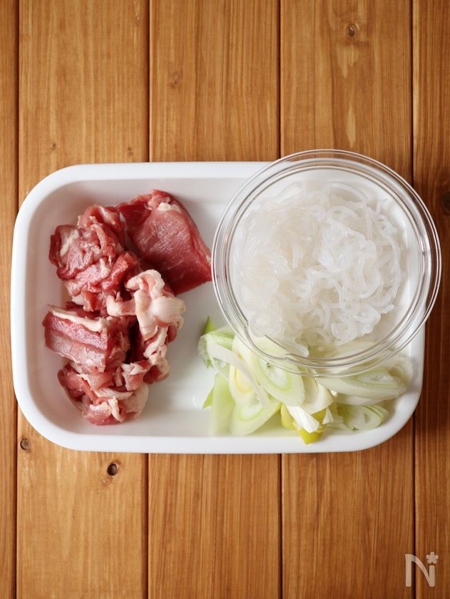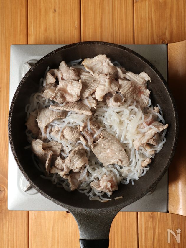 白滝のアク抜きをする際は、豚こま肉を炒める前に