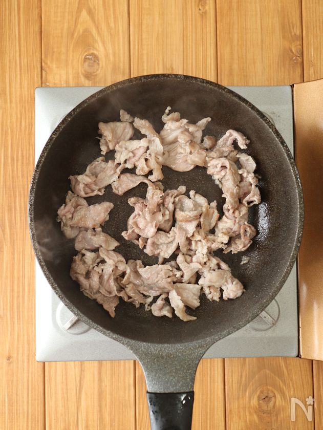(3) 中火で熱したフライパンにサラダ油を引き、豚こま肉を炒める。