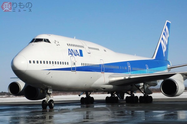 雪の中に駐機するANAボーイング747型機(画像:ANA)。