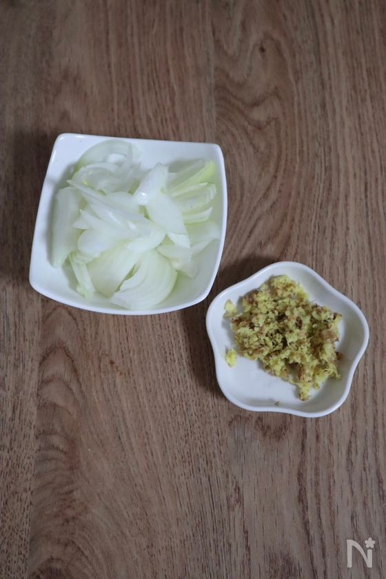 (2) その間に玉ねぎは薄切りにし、生姜をすりおろしておく。