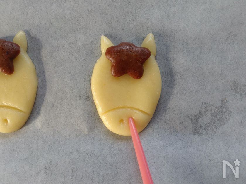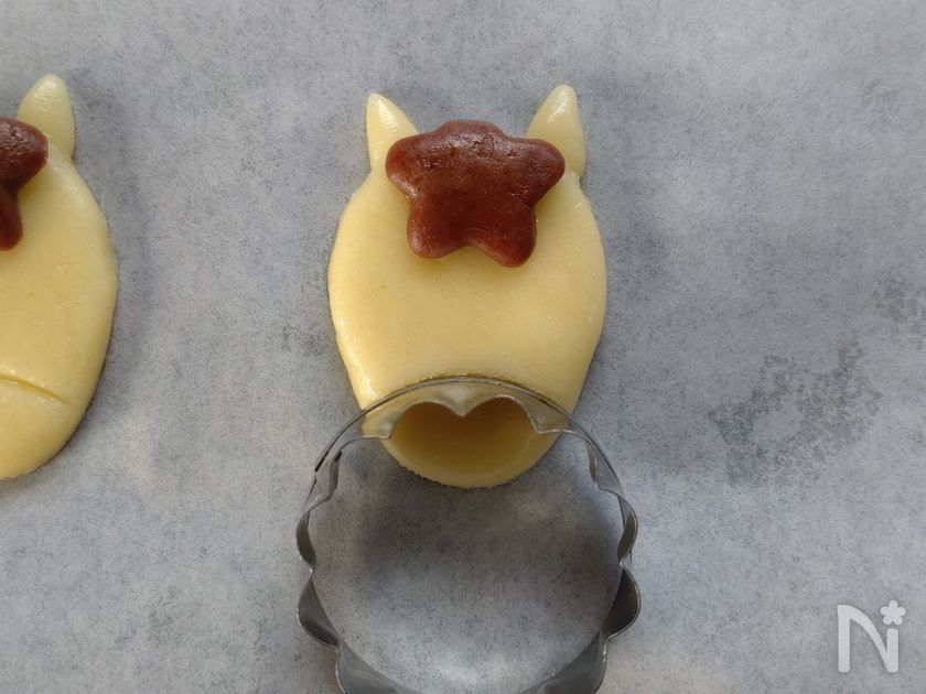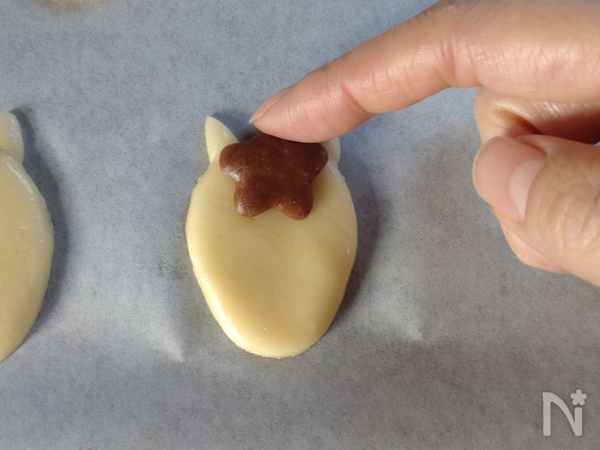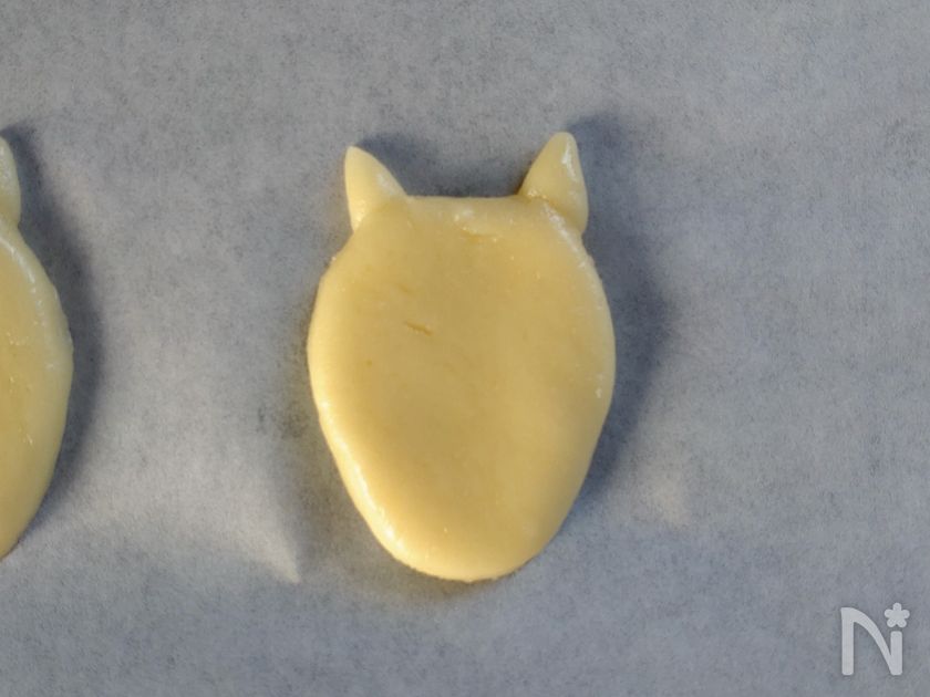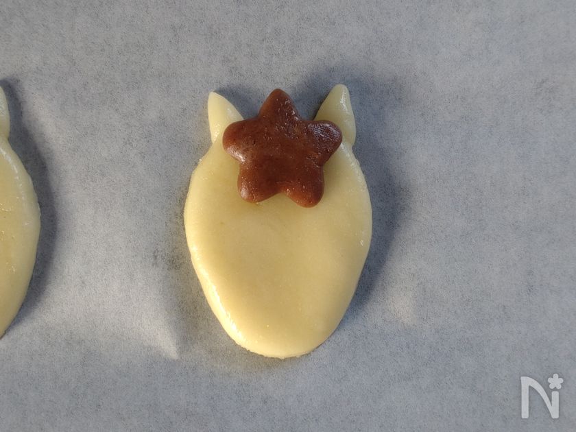 (6) しずく型の尖っている方が上になるように顔のパーツの下に置いて馴染ませる。オーブンを160度で予熱する。