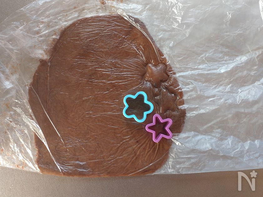 (7) ココア生地を袋のまま麺棒で2mmの厚さに伸ばし、袋の上から小さめの星型で型抜きする。(たてがみ)