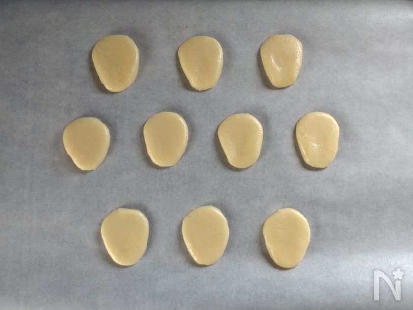 (4) 卵型になるように形を整えたら細い方が下になるようにクッキングシートを敷いた天板にのせる。(顔)
