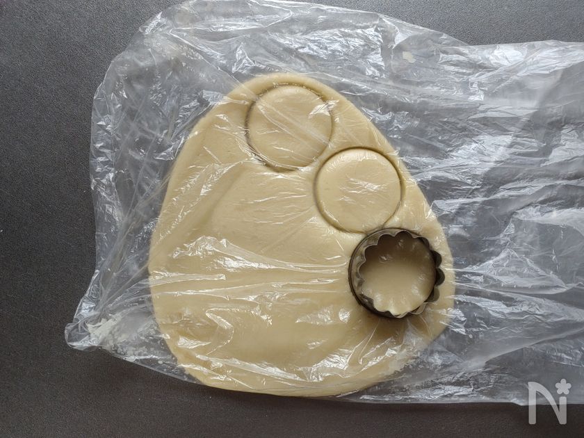 (3) プレーン生地を袋のまま麺棒で3〜4mmの厚さに伸ばし、袋の上から丸型で型抜きする。