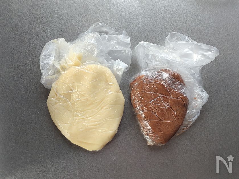 (2) ココア生地:ポリ袋に【C】を入れ混ぜてから【D】を加え同様に作る。