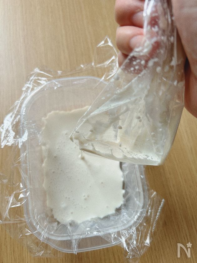 (4) 袋の先端をハサミで切り、生地をタッパーに流し入れる。600Wの電子レンジで2分加熱する。