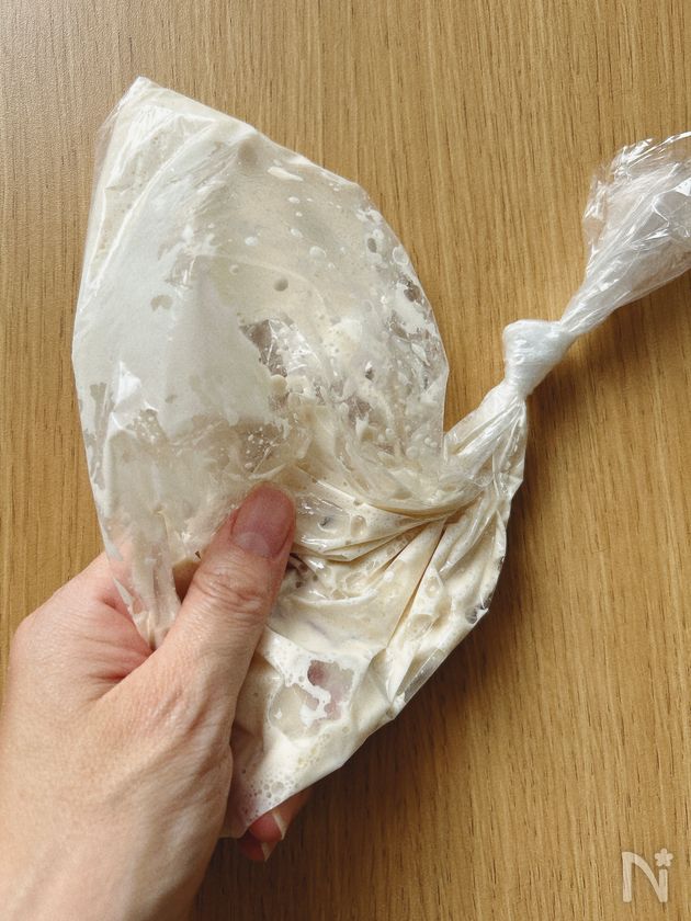 (3) 袋の空気を抜いて口を結び、手でもんで生地を均一にする。