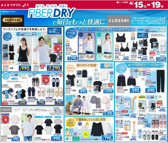その他、接触冷感や吸水速乾に優れた「インナー各種(レディース)」(1089円)、「カップ付インナー各種(レディース)」(1419円)などの機能性インナー、綿100%が心地良い「パジャマ各種(メンズ/レディース)」(2420円)、優れた速乾性でサラリと快適な「レギンス各種(レディース)」(979円)など、高機能アイテムも多彩なラインアップで登場しています。