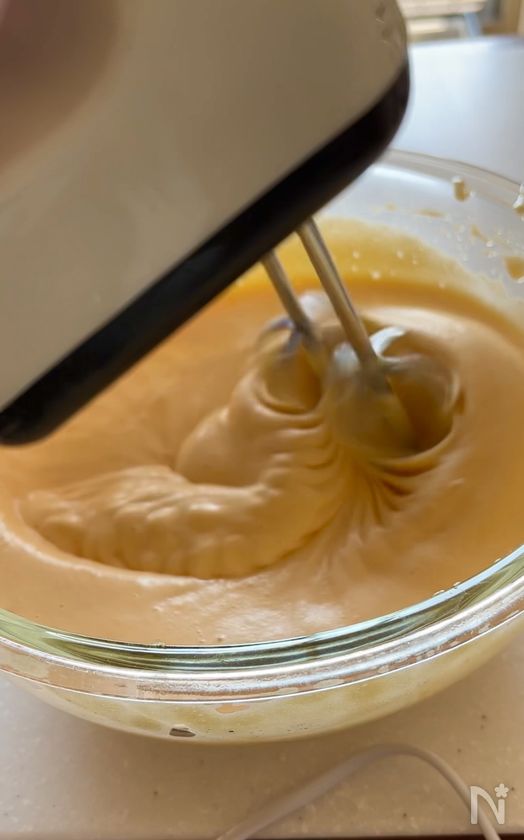 (ふんわり白っぽくなりキメが細かくなるまで。生地を持ち上げて垂らしたときにリボン状の跡がゆっくり消えるぐらいがベストです!)
