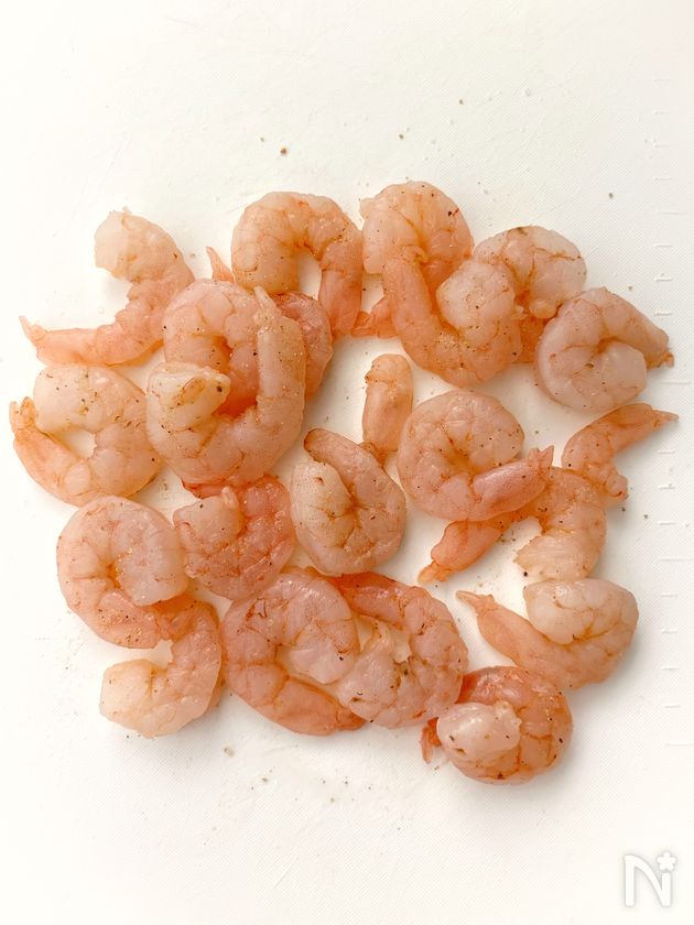 (1) むき海老は、水気をよくふき取り、塩こしょうをふる。