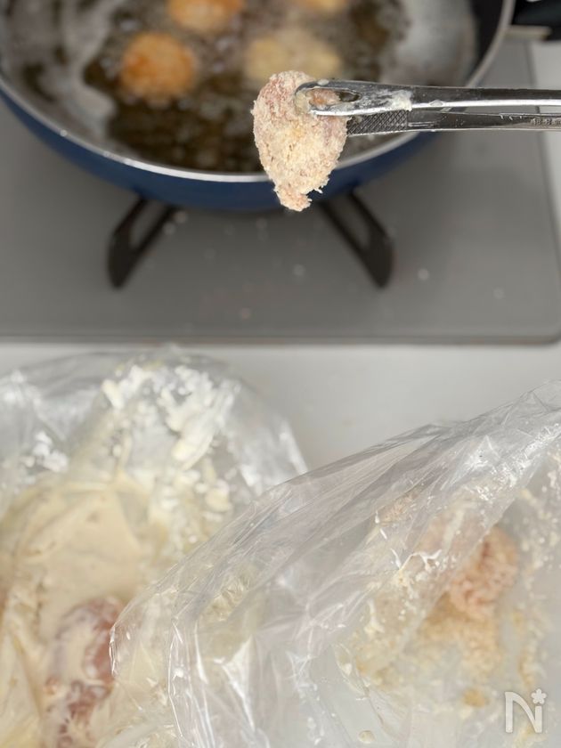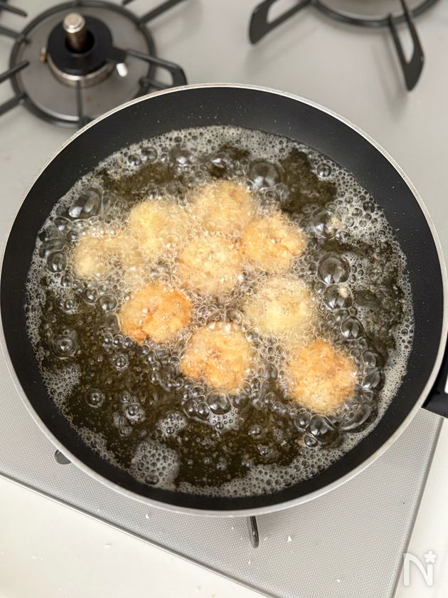 (4) フライパンにサラダ油を1cmの高さまで注ぎ、温度を170℃まで上げたら、衣をつけたむき海老を入れ、衣がサクッとなり、色づくまで揚げる。