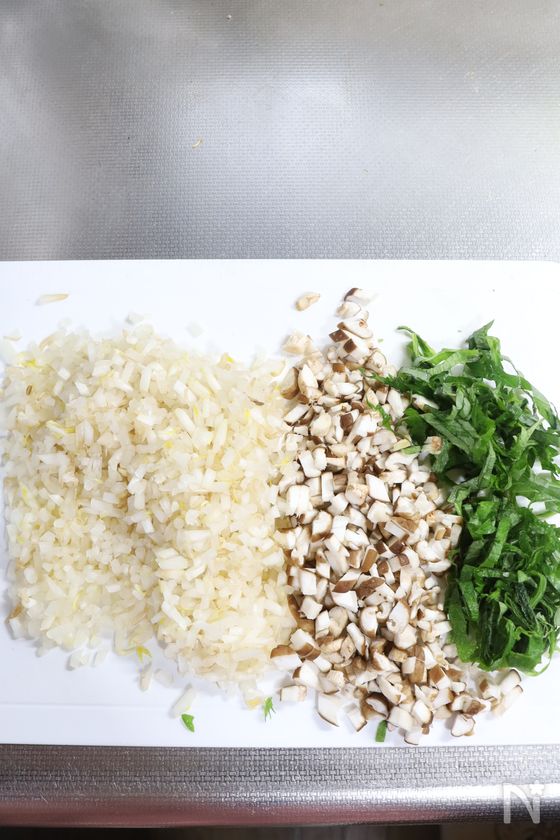 (1) もやし、椎茸(軸も含む)はみじん切りにする。大葉は茎を落として千切りにする。