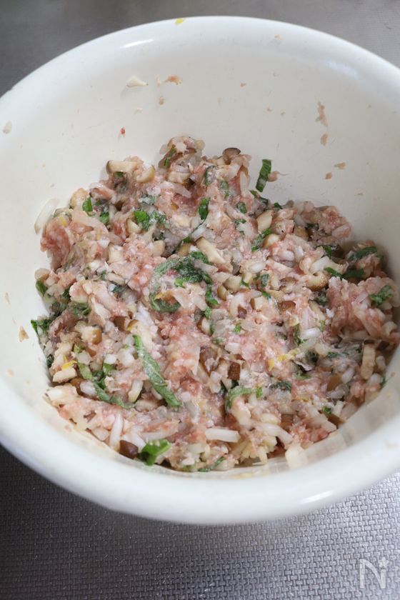 (2) ボウルに豚ひき肉と【A】を入れ、よく練り混ぜたら、①を加えて混ぜ合わせる。