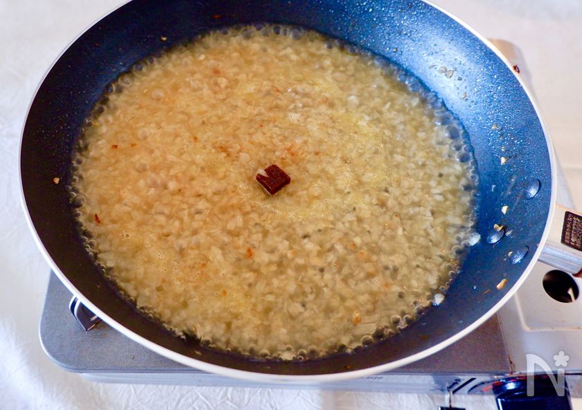 冷凍玉ねぎをたっぷり使ってください。水分が少なくなってからは焦げやすいので、丁寧に炒めるように気をつけてください。