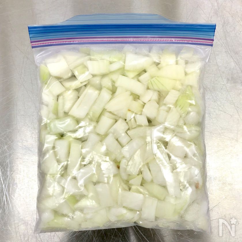 (下準備) たまねぎは皮をむき、粗みじん切りにして、ジップロックに入れて冷凍する。