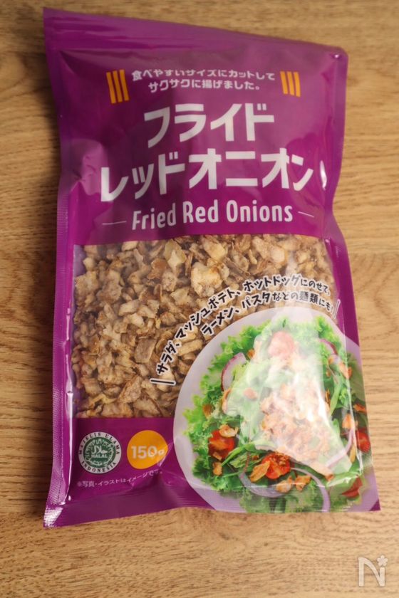 (4) 業務スーパーのフライドレッドオニオンを使用しました。袋を開けた瞬間から香ばしい香りが広がり、サラダ・スープ・炒め物まで幅広く使える便利アイテムです。ジッパー付きで保存しやすいのも嬉しいポイントです。