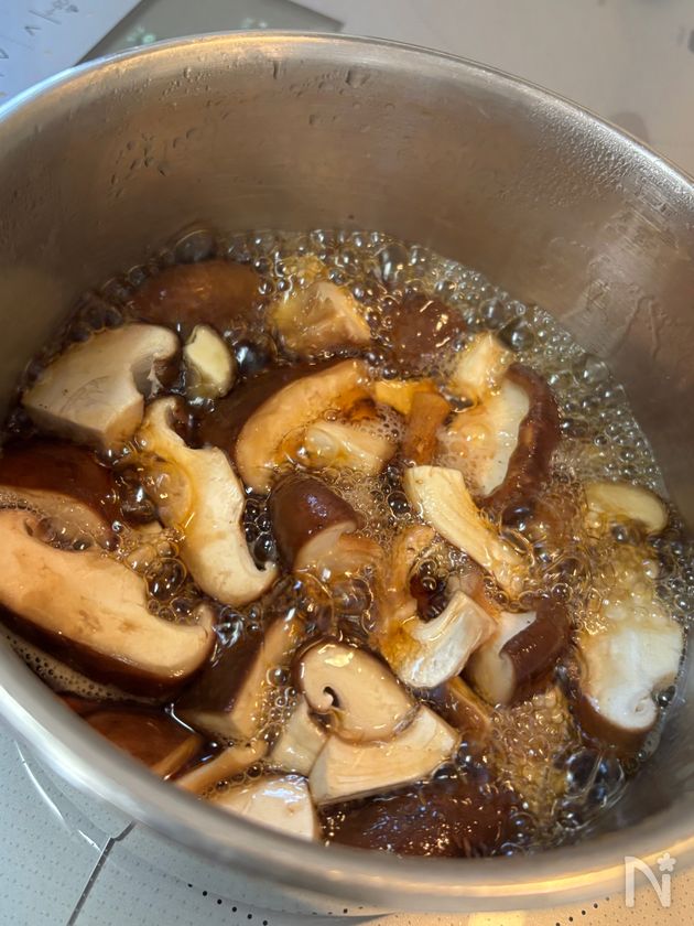 (2) 鍋に【A】を入れ煮たったら椎茸を入れる。
