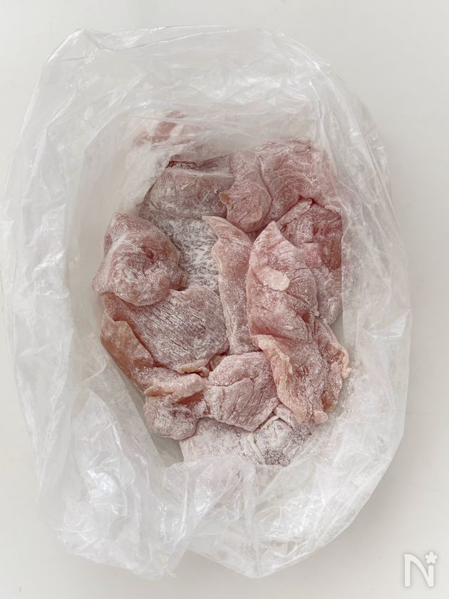 (2) ポリ袋に、鶏むね肉、片栗粉を入れ、ポリ袋を膨らませるようにしながら上下にふり、片栗粉をまぶす。