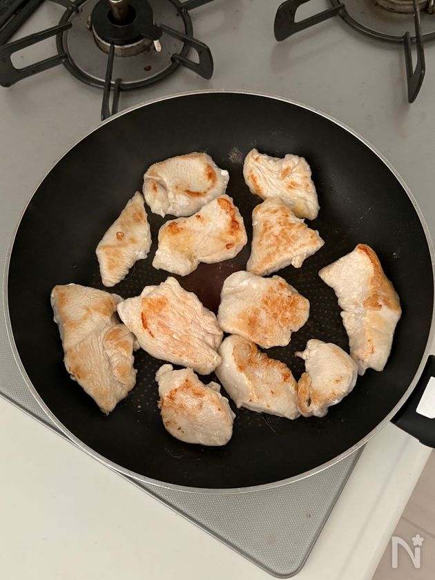 (3) フライパンにサラダ油をひき、鶏むね肉を入れ、フライパンの蓋をして、中火で3分ほど蒸し焼きにし、ひっくり返してさらに2分ほど蒸し焼きにする。