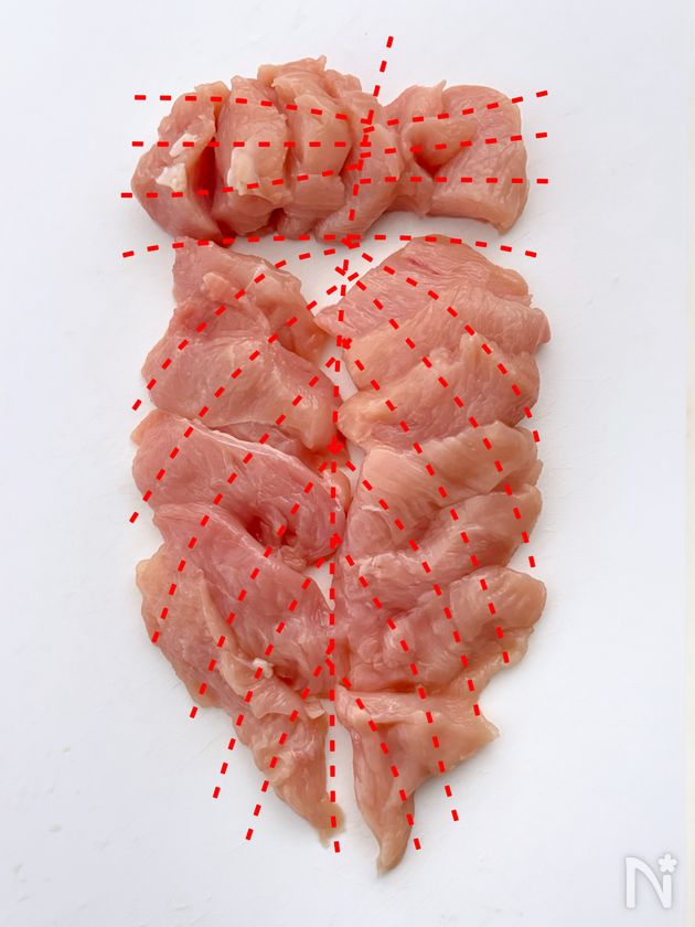 (1) 鶏むね肉は、皮を取り除き、繊維を断ち切るようにそぎ切りにし、塩こしょうをふる。