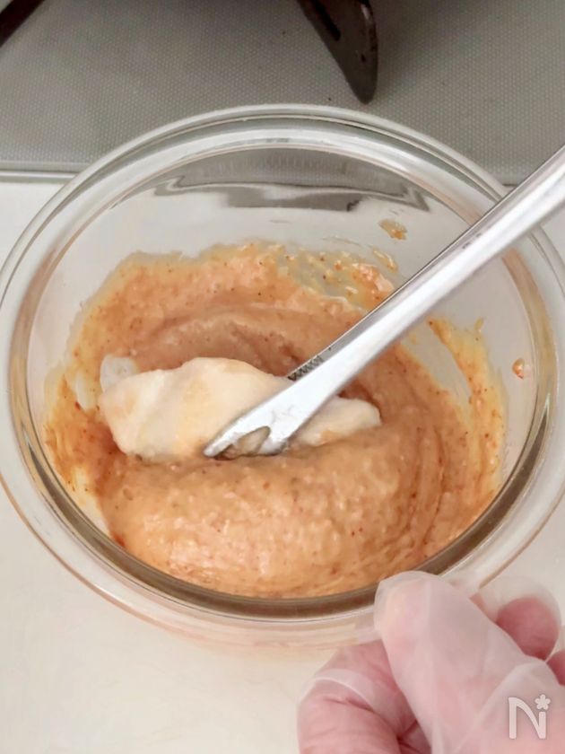 (5) 鶏むね肉を、④のごま味噌マヨにくぐらせ、器に盛り付け、パセリパウダーをふる。