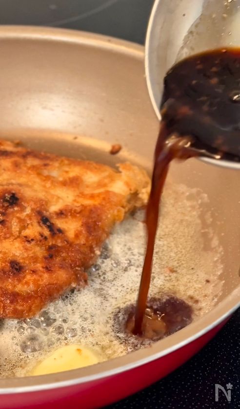 (5) 両面焼けたら、余分な油をキッチンペーパーで拭き取り、バターを加え、溶けてきたら、④で合わせておいたタレを加えて絡めていく。