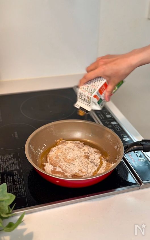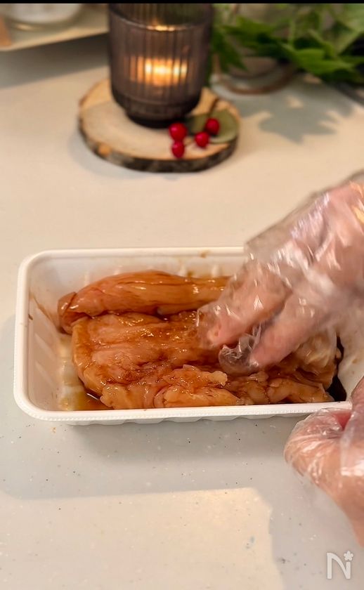 (1) 鶏胸肉を観音開きにし、厚さを均等にする。【A】を揉み込む。