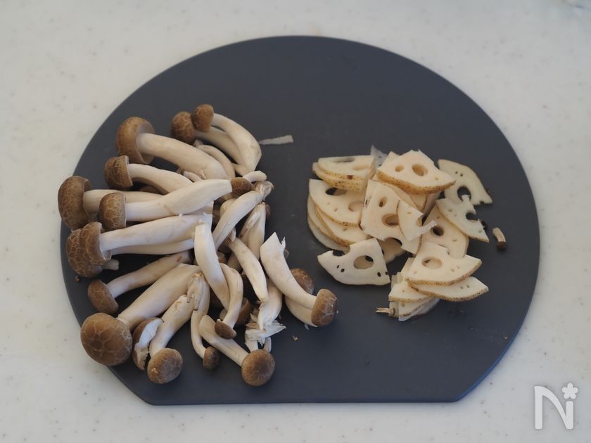 蓮根...厚さ2mmほどのいちょう切りにする。