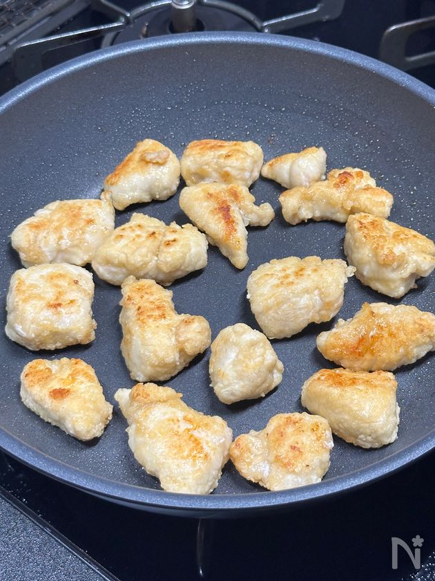 (3) 両面焼き色がついて火が通ったら、混ぜ合わせた【B】を加えて軽く煮からめる。
