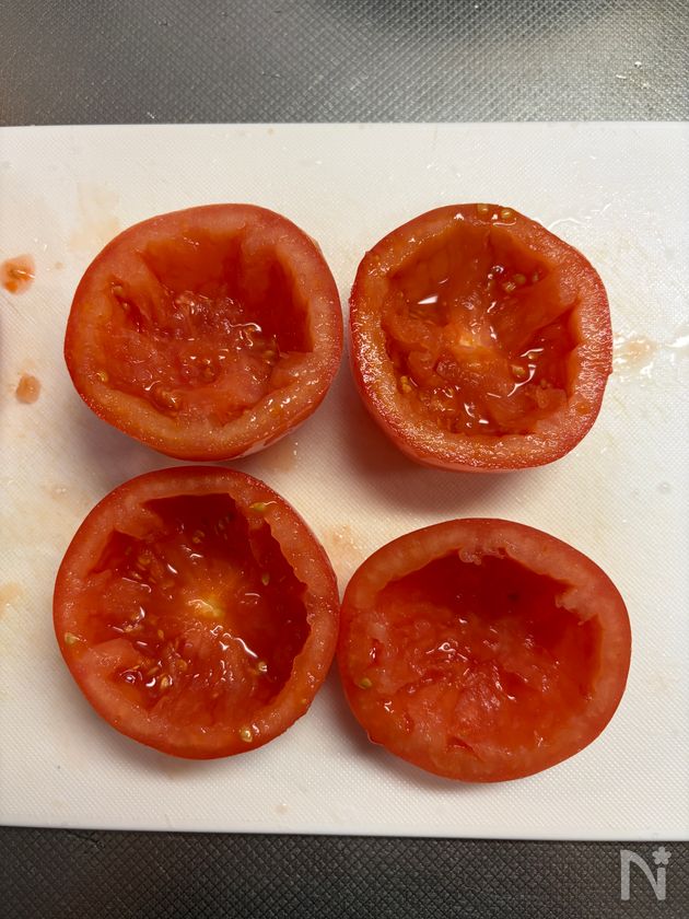 (下準備) ・トマトを横半分に切り、スプーンで中身をくり抜く。