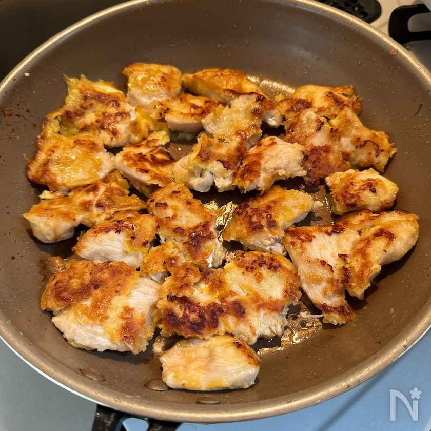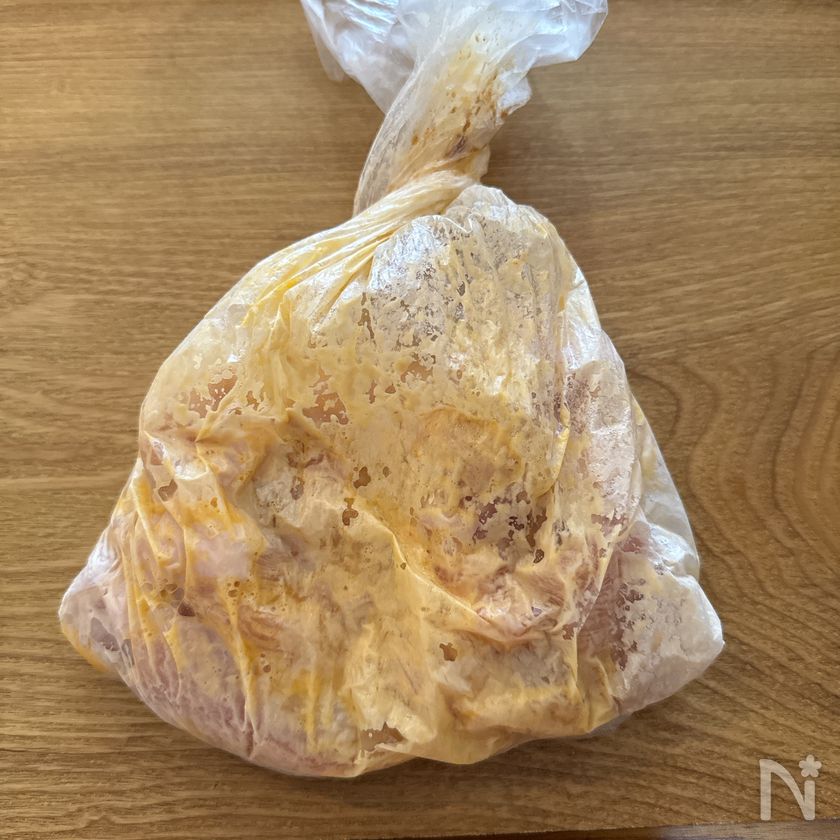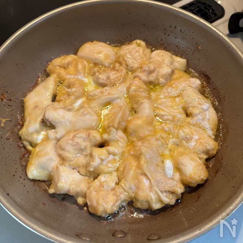※今回は手間抜きということで卵液もポリ袋を使用しました。見た目をもっと綺麗に焼きたい方は薄力粉、卵液の順番でボウルでつけて、フライパンへは鶏肉を1枚ずつ入れてください。