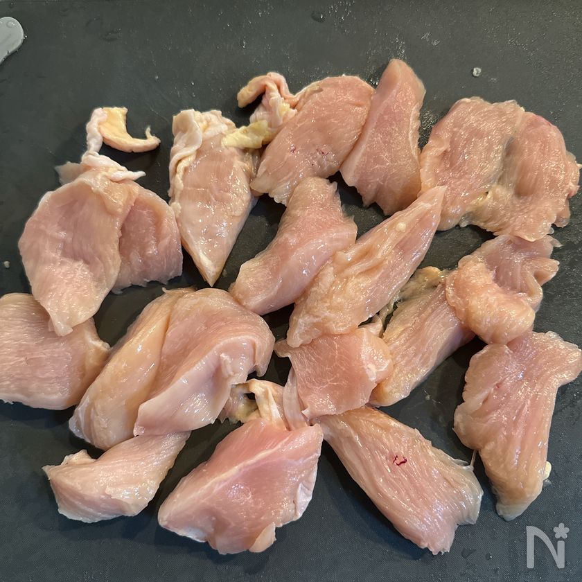 ・フライパンに並べる時はむね肉が重なっていると卵液同士がくっついて卵液が剥がれやすいので、オリーブ油を満遍なくひき、点火する前に離して並べてください。
