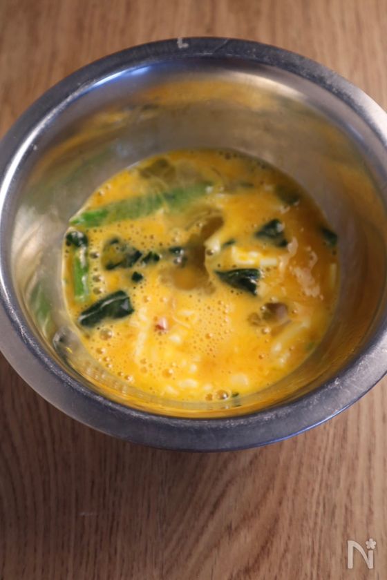 (1) ボウルに卵を割って溶いたらその他の材料(牛乳、コンソメ顆粒、砂糖、マヨネーズ、ピザ用チーズ、吊るしベーコン切り落とし、カットほうれん草を全て入れて混ぜ合わせる。